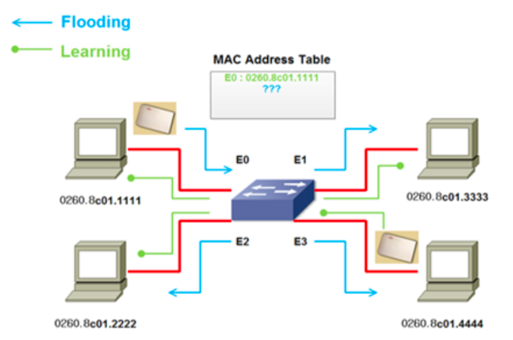 - Learning: MAC 테이블에 해당 주소가 없으면 수신한 포트와 출발지 주소를 MAC 테이블에 저장