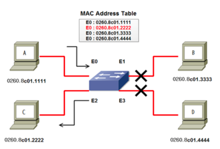 A가 C에게 Frame을 전달할 때 스위치는 MAC 테이블에서 목적지 주소에 대한 정보를 찾아 해당하는 포트인 E2로 Frame을 전달한다.