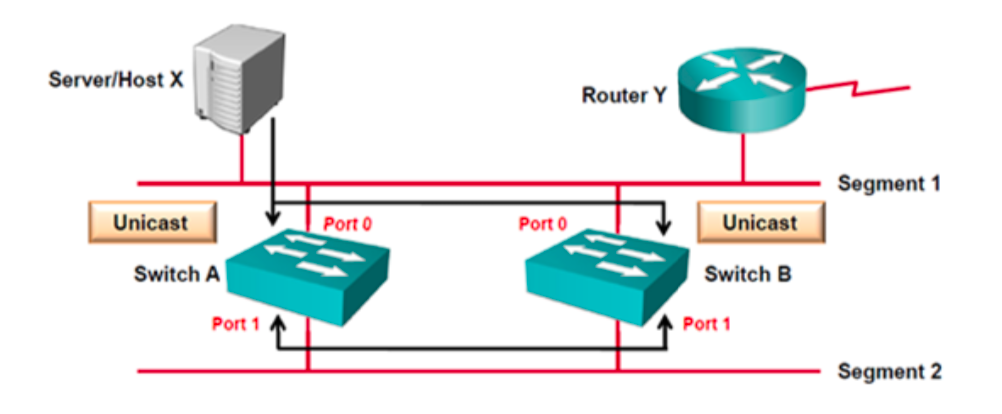 1) Host X가 보낸 Unicast Frame을 Switch A와 Switch B는 Port 0으로 수신