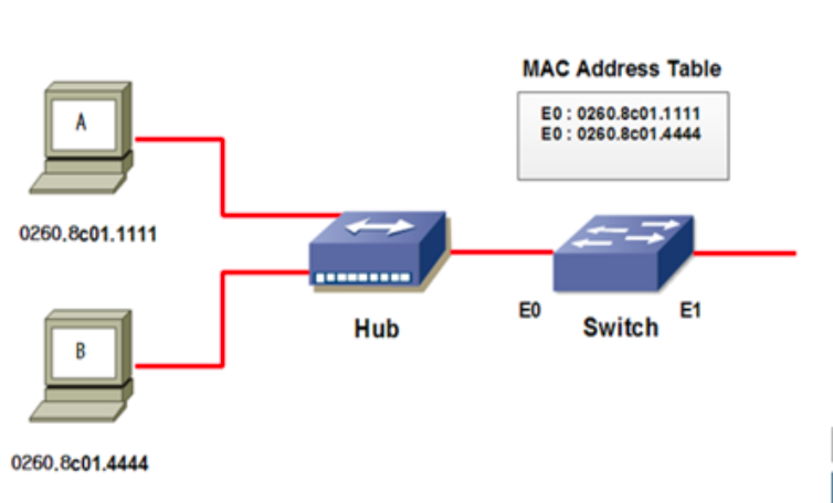 허브가 보낸 Frame을 받은 스위치는 A와 B가 같은 포트에 있는 것을 학습하고 이후부터는 A와 B의 통신시에 받은 Frame은 다른 포트로 Flooding하지 않고 Filtering한다.