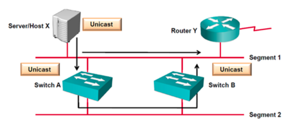 1) Host X가 Router Y에게 Unicast Frame을 보내고 Router Y는 원본 Frame을 수신한다.