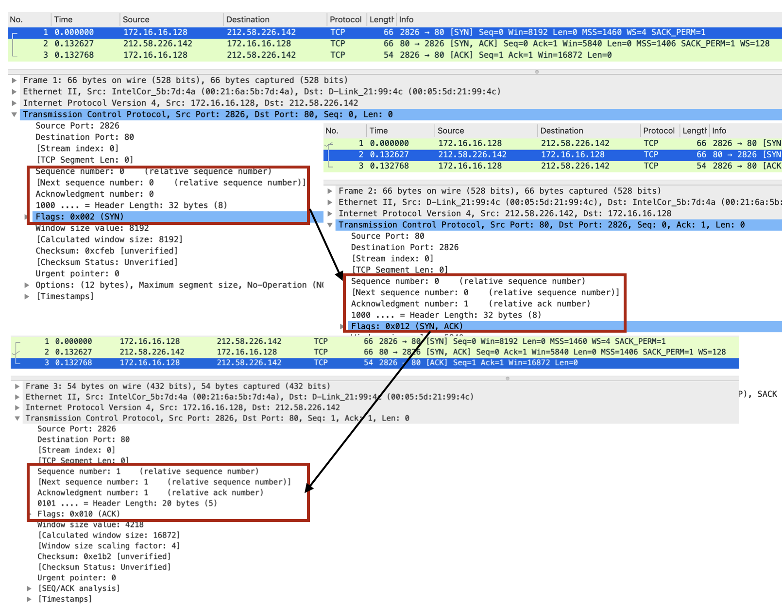 1) Client는 Server에 접속을 요구하는 SYN 패킷을 전송하는데, 이 때 Client는 SYN을 보낸 후 SYN/ACK응답을 기다리는 SYN_SENT 상태 (Seq는 랜덤, Ack는 Seq + 1)
