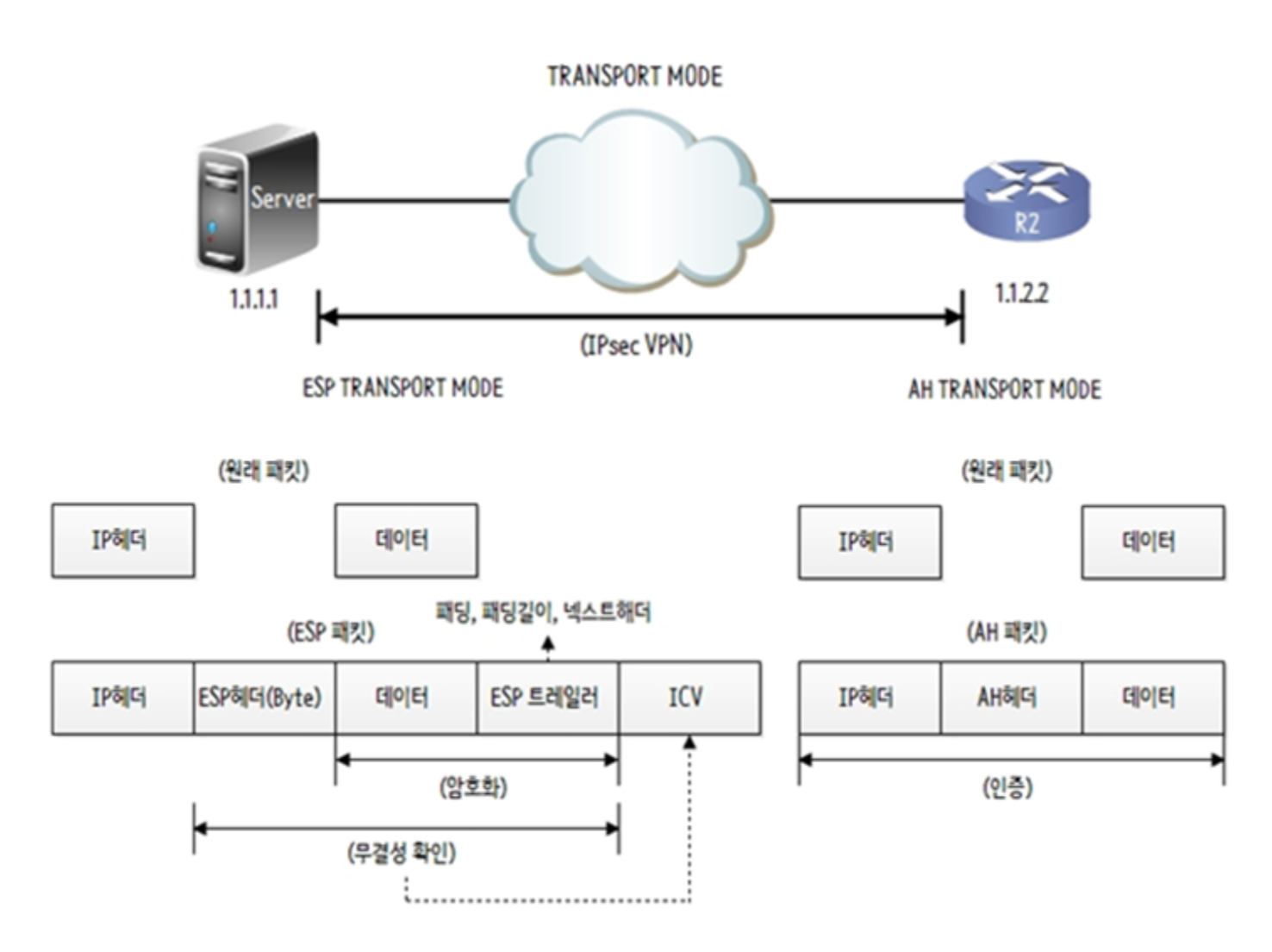 IPsec VPN은 원래의 데이터 패킷에 VPN 장비의 새로운 IP 헤더를 추가하는지의 여부에 따라 Transport mode와 Tunnel mode로 구분할 수 있다. 종단 장비 사이에 직접 IPsec VPN을 이용한 통신이 이루어지는 경우에는 일반적으로 Transport mode를 사용한다. Transport mode를 사용하면 20바이트 길이의 추가적인 IP 헤더를 사용하지 않는 반면, 보안 통신을 하는 두 장비의 IP 주소가 외부에 노출된다.