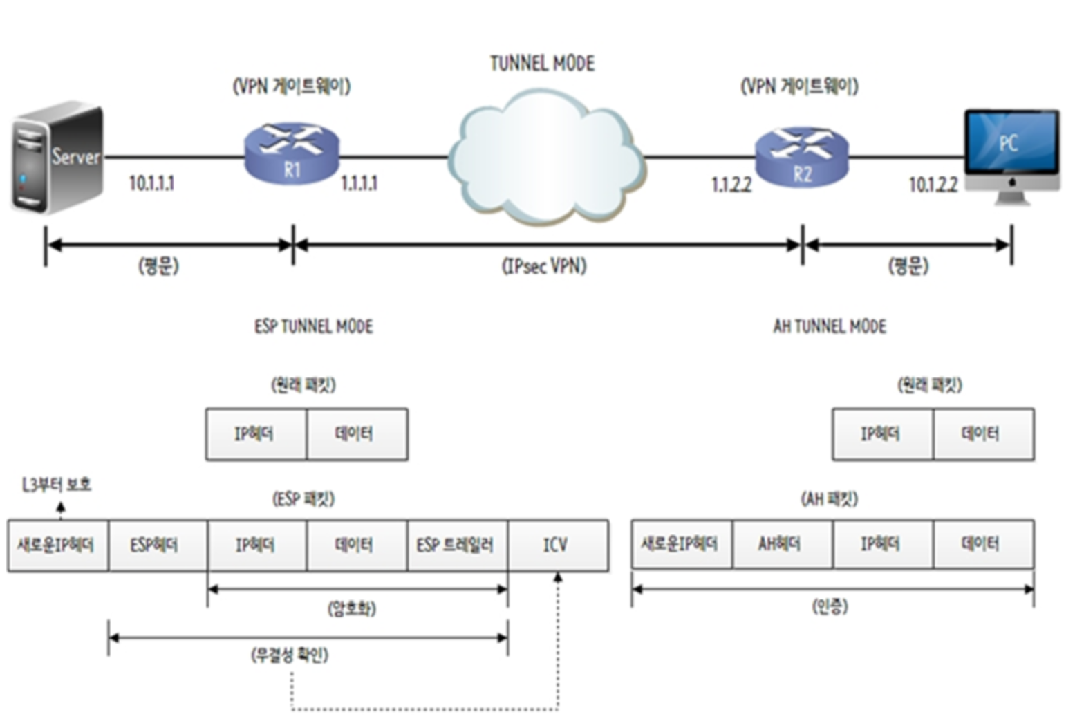 - ESP (Encapsulation Security Payload) 또는 AH (Authentication Header) : 실제 데이터를 encapsulation하고 보호하기 위한 프로토콜이다. ESP는 데이터를 암호화시키고 무결성 확인 기능이 있는 반면, AH는 암호화 기능이 없어서 많이 사용하지 않는다.