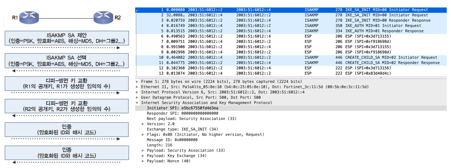 - IKE (Internet Key Exchange)와 ISAKMP (Internet Security Association and Key Management Protocol) : 통신 당사자를 인증하고, 보안 통신에 필요한 보안 정책 집합인 SA를 결정하며, 보안 통신에 필요한 여러가지 키를 결정하기 위한 프로토콜이다.