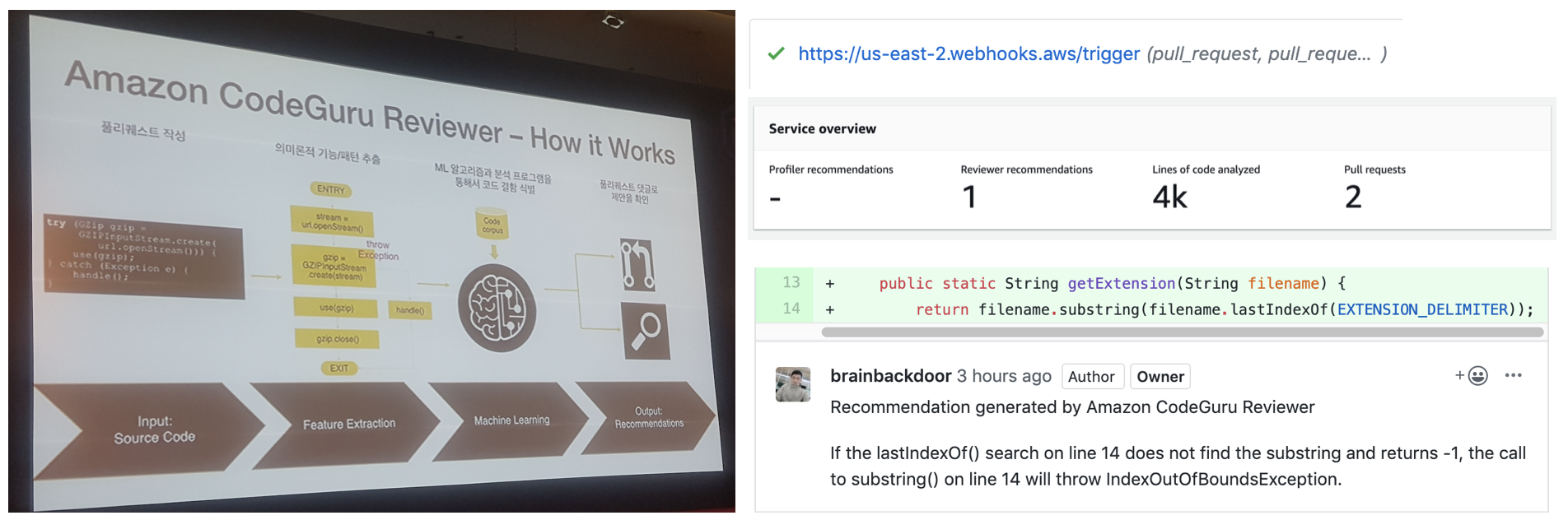 CodeGuru Reviewer는 github repository를 associate하면 자동으로 webhook이 설정된다. 이 후 Pull Request를 보내면 코드를 읽은 후 10여분 후에 associate할때 인증했던 github 계정으로 리뷰를 달아준다. 이 때 Reviewer가 다루는 영역은 크게, '올바른 AWS API를 사용하는지', '동시성 구조를 올바르게 구현했는지', '리소스 처리를 제대로 했는지(DB 연결 해제 등)', '민감 정보가 유출되는지' 등이다. 객체지향 설계, 클린코드, 리팩토링, ATDD, DDD 등 도메인 설계 내지 소프트웨어 아키텍처를 미션으로 부여하고 리뷰하는 Nextstep에서는 당분간 사용할 일은 없겠다. 오히려 이 기능은 Production 환경에서 개발자들이 보다 비즈니스 로직에 신경 쓸 수 있도록 돕는데에는 유의미하다고 생각한다. 비즈니스 로직에 대한 코드리뷰를 해줄 가능성이 없는지에 대한 물음에는 발표자 분이 AWS 관계자가 아니어서 답하기 곤란하다고 하셨다. 사실 이 기능이 되는줄 알고 어떻게 학습시켰을까 궁금해서 갔던 거였는데..