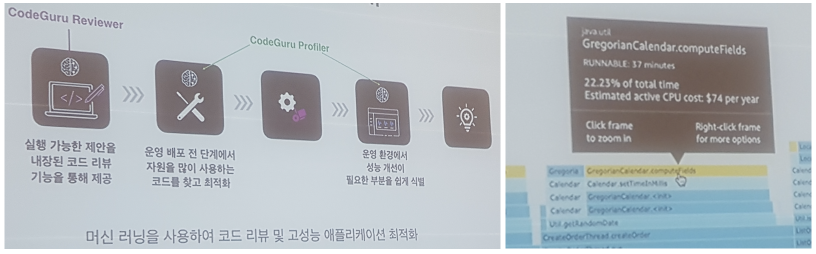 CodeGuru에는 Reviewer와 Profiler 두 가지 기능이 있는데, 기능 설명을 한번 보자. "Amazon CodeGuru는 자동화된 코드 검토 및 애플리케이션 성능 권장 사항을 제공하는 기계 학습 서비스입니다.", "Amazon CodeGuru 프로파일러는 항상 애플리케이션 성능 최적화를 검색하고, 가장 “비경제적인” 코드 줄을 식별하며, 이러한 코드를 수정하여 CPU 사용률을 줄이고 컴퓨팅 비용을 절감하고 애플리케이션 성능을 개선할 방법을 권장합니다."