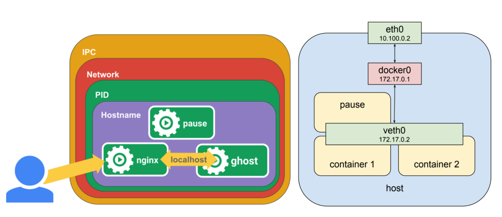 pause 컨테이너는 pod의 컨테이너들이 namespace를 공유하여 컨테이너 간에는 localhost로 통신할 수 있게 한다. (IPC 통신도 가능)