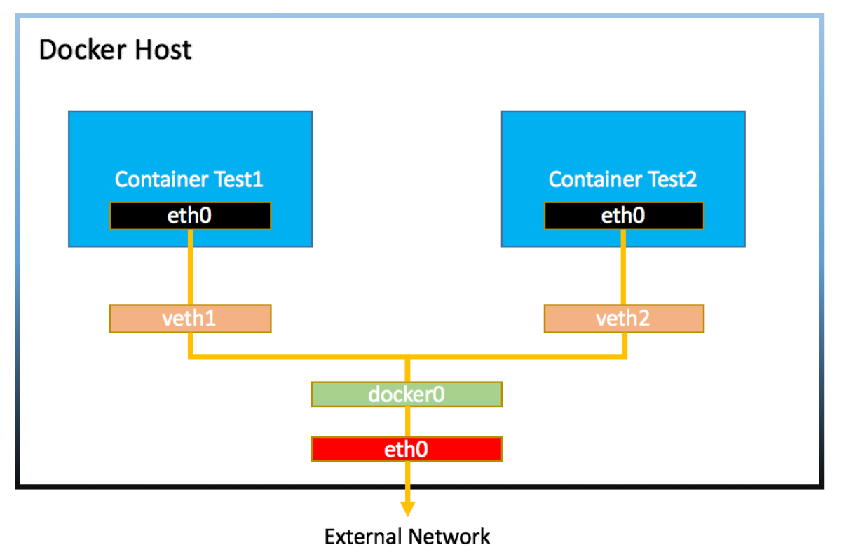 즉, container가 생성되면, 이 pair interface 의 한 쪽은 container 내부 namespace에 할당(eth0)되며, 나머지 하나는 vethXXXX 라는 이름으로 docker0 bridge에 binding된다. docker0는 docker 실행시 자동으로 생성되는 가상 브릿지로 Container는 외부와 통신할 때 docker0 브릿지를 거쳐 통신을 하며, docker0 브릿지에 할당된 IP 대역에 맞춰 컨테이너 IP가 할당된다.