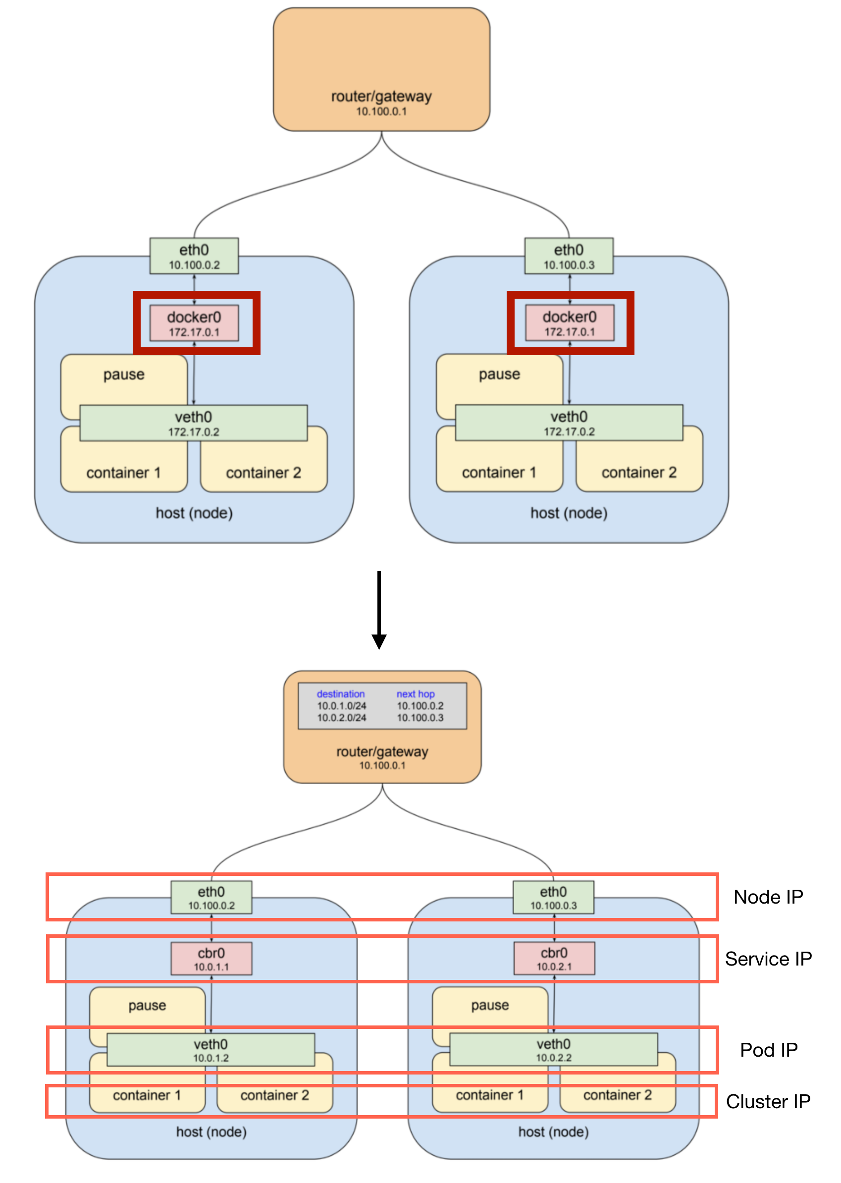 Kubernetes는 이처럼 각 Node의 Bridge가 서로 겹치지 않게 주소 대역을 할당한 수 routing table을 작성한다. 이렇게 Virtual Network Interface와 Bridge, Routing Rule의 조합을 일컬어 overlay network라 한다.