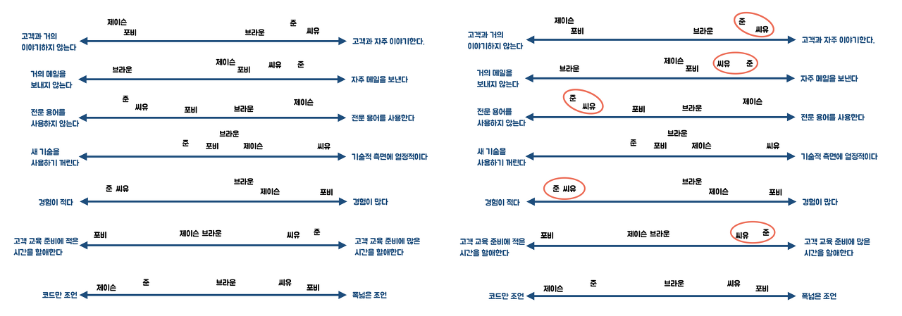 모집단이라고 믿는 대상과 비교하지 말고 각 인터뷰 참가자들끼리 비교하면서 배치한다.